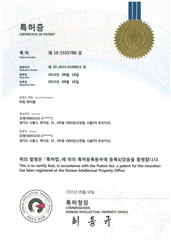 국내 최초로 병렬식 히팅케이블 생산방식에 관한 기술력을 인정 받은 특허입니다